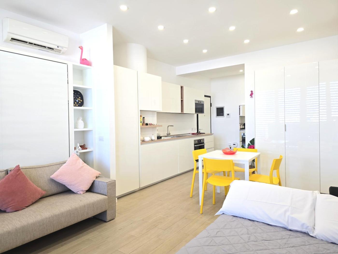 Appartamento Monolocale. The air-conditioned apartment features 1 bedroom and 1 bathroom with a shower and a bidet. The well-equipped kitchen has a stovetop, a refrigerator, a dishwasher and kitchenware. Featuring a terrace with city views, this apartment also provides a washing machine and a flat-screen TV. The unit offers 3 beds.